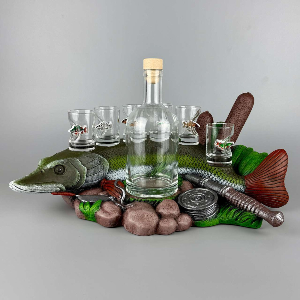 Оригінальна декоративна підставка у вигляді риби — стильне та практичне рішення для сервірування столу або прикрашання інтер’єру. Виріб ідеально підходить для розміщення штофа та чарок, створюючи завершену композицію для святкового застілля, барної зони чи подарункового набору.